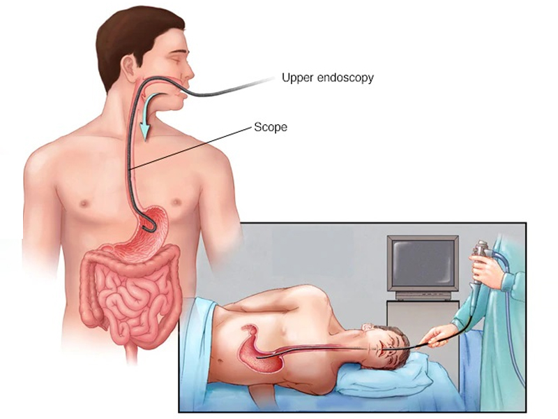 - Procedure : The endoscope is inserted through the mouth and advanced through the esophagus, stomach, and into the duodenum.